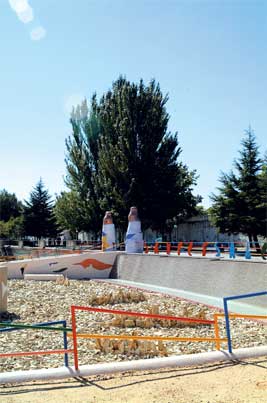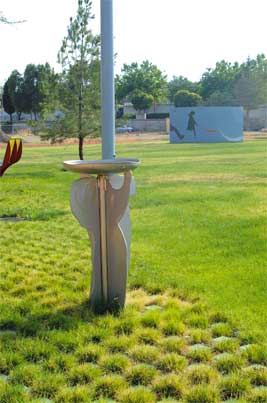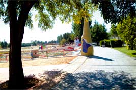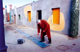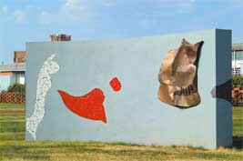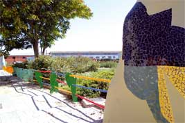 Elementos estéticos en el paisaje y el urbanismoLa intervención en este apartado, con propuestas de nuevos elementos plásticos para el embellecimiento de nuestras ciudades, es un hecho que muestra hasta donde Gabarrón quiere llevar su interés por sacar el Arte a la calle para uso y disfrute de todos. No solo exponerlo en los edificios, sino también en las calles, en las plazas y en los parques también y en los alrededores de nuestras ciudades, en los cerros, en las llanuras o en los valles próximos a ellas. Intervención en el paisaje.Siguiendo la misma filosofía hasta ahora descrita la instalación de grandes piezas artísticas en los exteriores, perfectamente integradas con las condiciones y el ambiente donde se ubican, se basa también, en parte, en la idea de recuperar los antiguos "hitos", empleados siglos atrás como una identificación del lugar. La propuesta aquí es crear esculturas o montajes gigantescos dándoles un sentido y una simbología y sobre todo una imagen actual, con la que todos podamos alegrar la vista y dar unos toques de color a nuestro viaje. Grandes masas de hierro y piedra, llenas de color, interrumpen así, la serena y hermosa, aunque a veces monótona imagen de los paisajes, durante los viajes más largos. La disposición de estas obras de arte a gran escala, en lo alto de las montañas, en las áreas de descanso, en cualquier paraje visible desde la carretera, o desde el avión, o desde el ferrocarril, pueden además aportar una serie de datos de fácil identificación con la zona visitada, pues las obras de arte también pueden desempeñar el papel de informar y de descubrir, hechos que son sencillos para uno de los artistas de nuestro tiempo, que brilla por su capacidad y fuerza para transmitir y comunicarse. Intervención en el urbanismo.Este apartado es muy extenso por la cantidad de elementos plásticos llevados a las más variadas propuestas. No sólo abarca una intervención plástica sobre edificios, como puede ser la ubicación de determinados murales, aprovechando ciertas estructuras de los mismos, o interviniendo en sus grandes recibidores o portales, sino que de la misma forma nos podemos encontrar con paneles llenos de color, que han sido adecuados a las estructuras de los anuncios de las ciudades. Para Cristóbal Gabarrón, cualquier excusa, cualquier espacio es apropiado para una intervención plástica y para ello indaga el uso que pueden prestar a la sociedad las imágenes de su obra.Un almacén, un gran espacio cerrado en transparente, puede ser el lugar más apropiado para realizar un gran techo de color, la publicidad de los autobuses y metro puede ser sustituida por una obra, al igual que los diferentes transportes públicos y sus estaciones, un avión, un aeropuerto, etc. Incluso los lugares más extraños un estadio, una fábrica o el dique de una presa. Hay una parte importante de este estudio, que se explica en el apartado de los conocidos por el nombre de "muebles urbanos". Con este nombre se hace referencia a todos esos elementos, de uso cotidiano, que nos encontramos en las ciudades, en los parques o en las zonas ajardinadas, para uso del público. Nos referimos a objetos como papeleras, bancos, buzones, fuentes, farolas y cientos más que todos conocemos, incluyendo los "columpios" para uso de los niños. Gabarrón saca las imágenes de su obra y añade a la simbología el uso. Las famosas cadenas o el balancín o la ruleta o el tobogán, no dejan de ser objetos de juego, cuya imagen se ha quedado corta para poder despertar la imaginación y la curiosidad del niño. Lo que Gabarrón pretende en este campo es devolver la magia y el misterio de estos juegos revolucionando totalmente su forma y su concepto. Se trata, dicho de forma muy rápida, de disfrazar valiéndose de la plástica y del arte lo que hasta ahora entendíamos por columpio e introducir nuevas formas con nuevas posibilidades de diversión. En el desarrollo de estos estudios he visto como el tobogán, por ejemplo, deja de ser en este programa una pendiente metálica más o menos alta por la que los niños se deslizan y pasa a convertirse, por ejemplo, en las tripas de una ballena, que el Maestro saca de una de sus obras, y que realiza en unas proporciones adecuadas y unos materiales seguros, que permite además a los niños, no solo deslizarse por su interior, desde arriba, sino también caminar o saltar sobre ella sin riesgo de peligro alguno. El ejemplo de la ballena ha sido solo una forma para dar una imagen física a este proyecto., pues cualquier forma creativa, abstraída de su obra podría ser un original "mueble urbano". Podemos hablar de animales ondulantes llenos de colores, por los que corren y saltan los niños de la rosa de los vientos, por cuyo interior los pequeños pueden subir, bajar intercambiar los ejes de la rosa, convertidos en escaleras de colores y de cientos de figuras transformadas y adaptadas para divertir y enseñar a jugar a los niños con creatividad y originalidad. Como he mencionado antes, también las farolas, y el resto de los elementos que enmarcamos en "muebles urbanos", dejarían de ser elementos fríos en los que el color y la forma tendrían especial importancia. Primero como revestimiento atractivo para despertar el interés y la curiosidad del público, utilizando colores muy fuertes y muy brillantes. En segundo lugar, en el caso de los elementos de los niños, como indicativo de ciertos mensajes que ya tienen en su inconsciente así aunque los juegos no tienen ningún peligro, como hemos mencionado antes, las partes más altas de los "muebles urbanos" llevarían una gama más caliente que inmediatamente sería asociada con una pequeña advertencia (para establecer una comparación sería la luz roja de el semáforo). Los interiores, en los cuales los niños pueden entrar libremente serían de colores claros y luminosos con el fin de evitar el temor de los niños a sentirse en un espacio interior y oscuro. Con este obj
